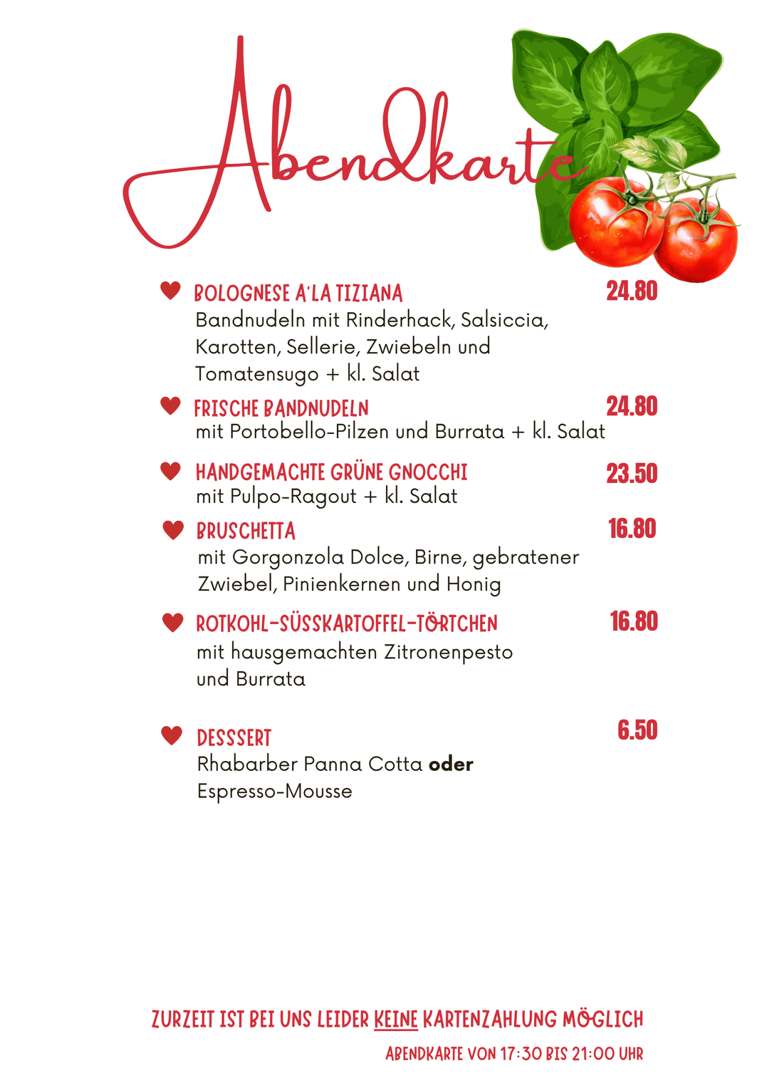 Von Mittwoch bis Samstag bekommt Ihr bei uns zwischen 17.30 und 20:30 Uhr u.a. Pastagerichte mit handgemachter Pasta: